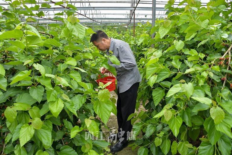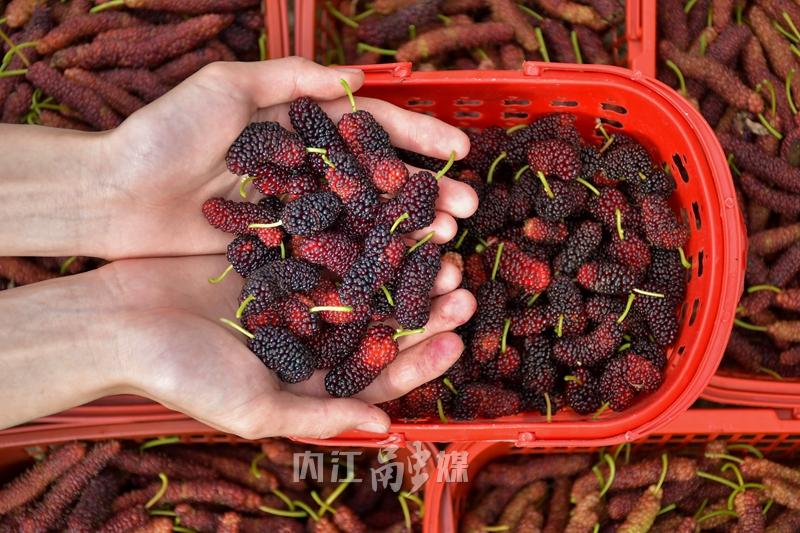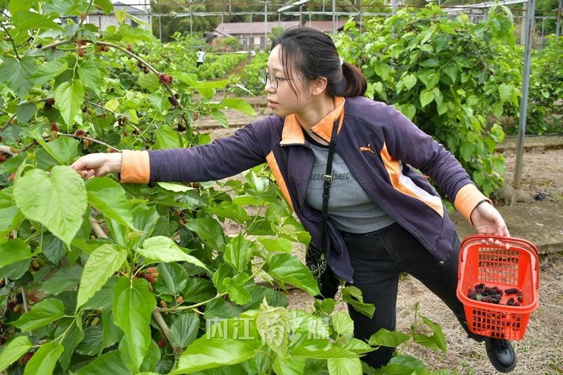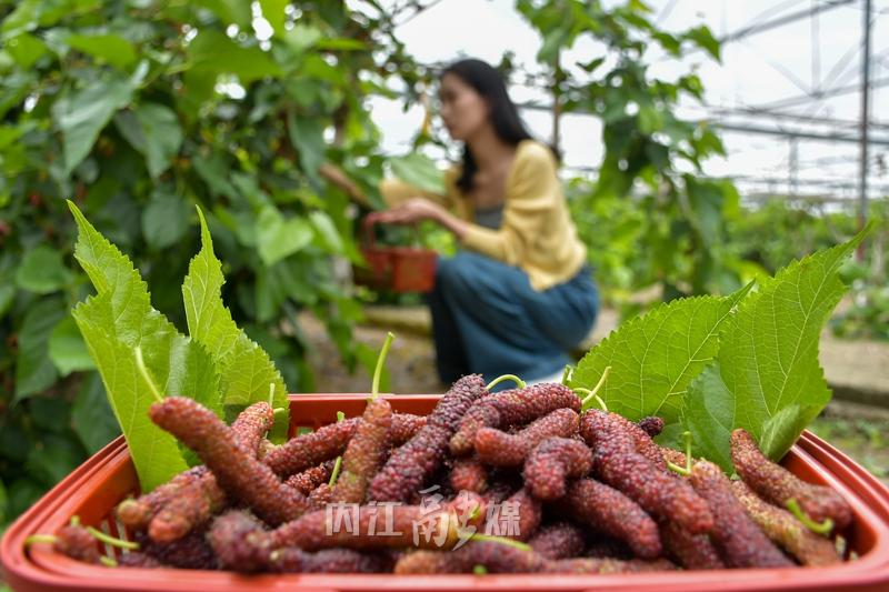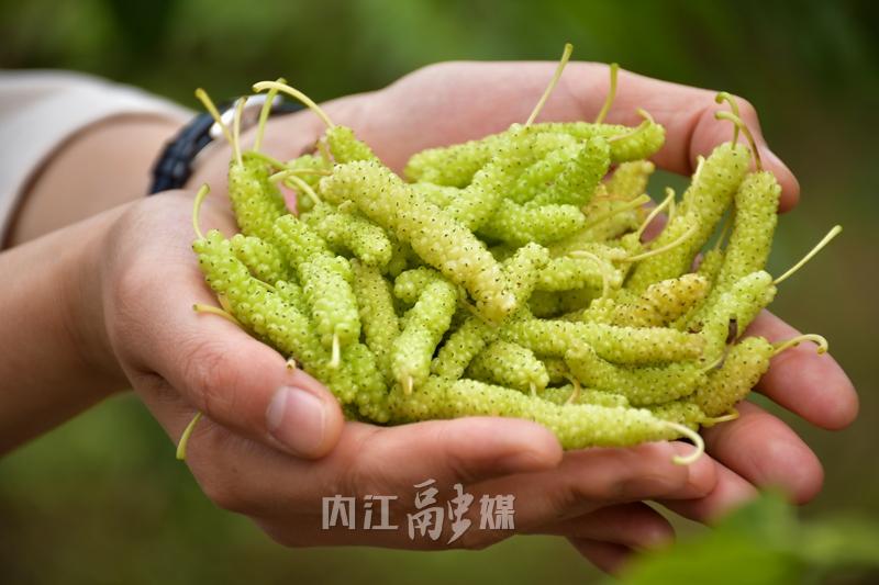 随后,记者走进东兴区田家镇正子村的东兴区田家镇蚕桑科技示范基地里看到,无核大实、白玉王、台湾长果桑等品种的果桑陆续成熟,一颗颗形态饱满、红黑相间的桑葚果实挂满枝头,在绿叶的掩映下格外诱人。