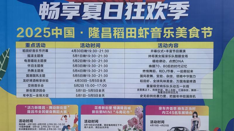 隆昌市文化广电和旅游局副局长李新真介绍,在“五一”假期期间,隆昌将继续举办“精致靓丽城•潮玩新隆昌2025中国•隆昌稻田虾音乐美食季”活动,届时活动主会场新街里文旅街区将有主题晚会、龙虾美食、群众文艺展演等活动;南关石牌坊景区和云顶山景区活动包括实景演艺、汉服巡游、古风快闪,还有藤编、剪纸等非遗体验;同时,还将派发“五一”美食娱乐消费券和莲峰大剧院“文化惠民观剧卡”,进一步激发消费新活力。