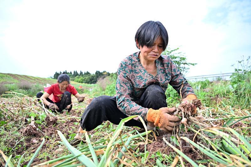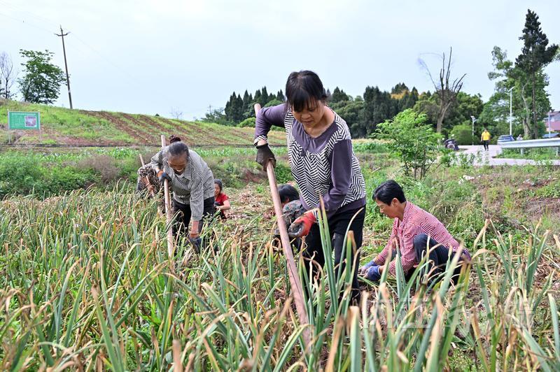 5月5日,东兴区东兴街道圣宴社区的群众抢抓农时采收大蒜。
