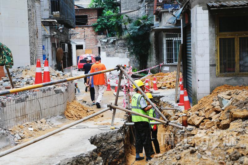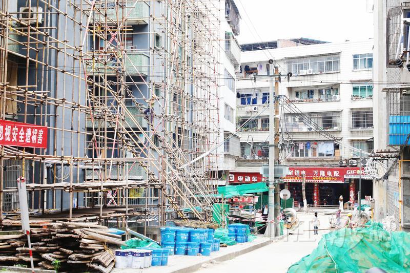 5月15日,隆昌市金鹅街道大南街社区居民新村,一栋栋老旧楼房外钢架林立,施工人员为墙面喷环保漆,让斑驳的墙面焕发新光彩;地面,机械设备轰鸣作响,施工人员各司其职,挖掘与平整作业有条不紊地进行。这里的14栋老房子,正经历着一场华丽蜕变。