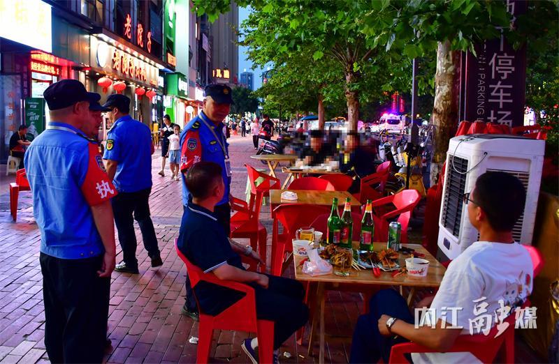 6月4日傍晚,在位于内江市东兴区的万达广场周边,城市管理综合执法大队队员周洪良和同事耐心向沿街餐馆老板、食客和水果摊主提醒,注意控制音量,共同为考生营造安静的备考环境。