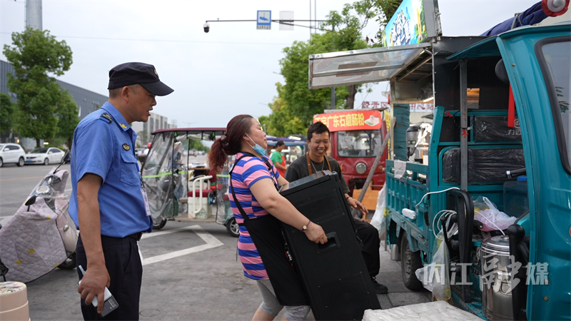 一阵音乐声传来,唐筱循声望去,发现一家摊位前设有音箱且正在播放音乐。唐筱快步上前,按下了音箱开关,对摊主说:“老板,中高考期间,为了孩子们能好好休息,这音箱就先别用了哈。”摊主有些不好意思地说:“哎呀,我这忙起来就忘了,谢谢你们提醒,我马上收起来,不用了。”