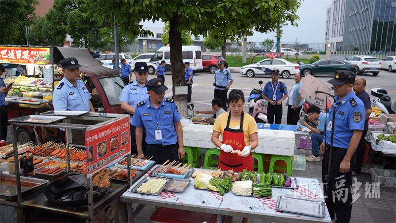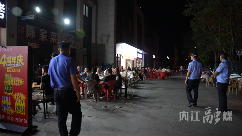 晚上7点,内江经开区综合行政执法局三中队中队长唐筱与公安民警一起,来到巨腾(内江)资讯配件有限公司外的夜市摊区,仔细检查是否有使用音箱、喇叭等扩音设备的情况。