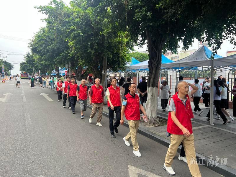 高考首日,身着统一服装的退役军人志愿者们早早抵达翔龙中学考点,分组投入服务工作:协助维护考生入场秩序,确保考生顺利进入考场;引导家长在等候区有序停留;配合交警疏导考点周边交通,避免车辆拥堵影响通行;同时,现场开展安全巡逻,排查潜在隐患,密切关注周围环境变化,以及应对可能出现的突发情况;对周边商户、群众进行文明劝导,减少噪音干扰,确保考试环境安静和谐。