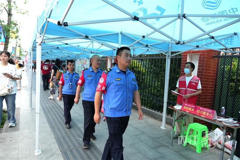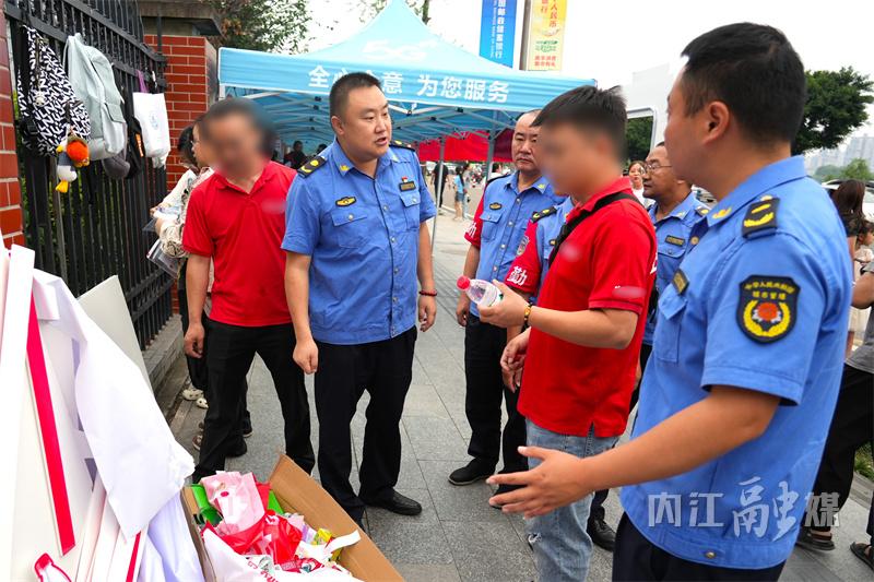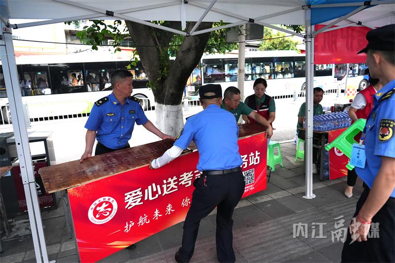 早上7时许,记者来到翔龙中学考点看到,内江市市中区城市管理综合行政执法大队的执法人员正在仔细检查考点周边爱心服务站的设置情况,引导志愿者有序摆放桌椅、饮用水等物资,维护现场秩序,保障服务站既能为考生和家长提供便利,又不影响交通和市容环境。