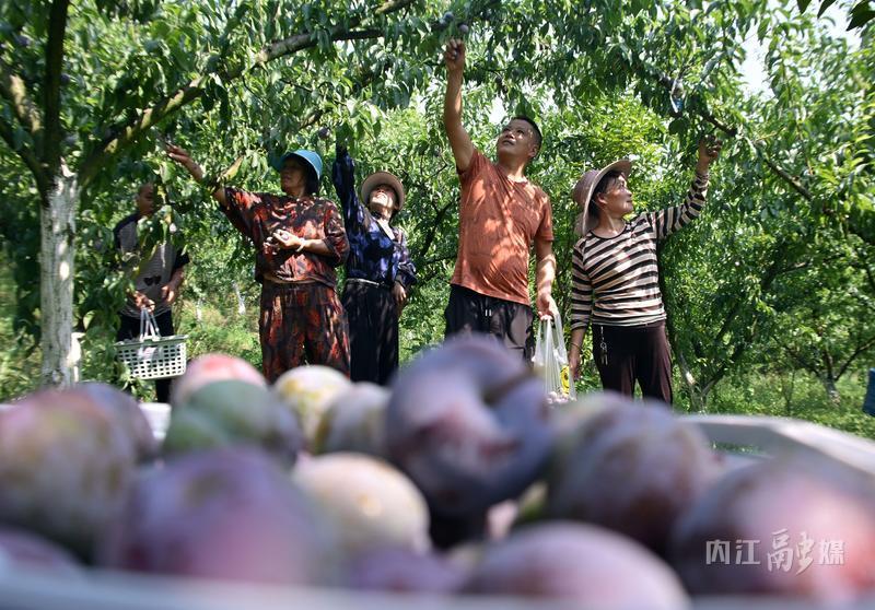 6月17日,东兴区永福镇山青庙村的乡情家庭农场一派繁忙景象。趁着晴好天气,村民们正忙着采收李子“五月脆”。经过装箱、打包后,销往全国各地。
