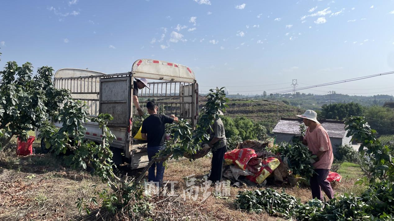 6月18日,记者走进兰家寺村的青花椒基地,映入眼帘的是一片翠绿,漫山遍野的花椒树郁郁葱葱,一簇簇颗粒饱满、色泽青绿的青花椒挂满枝头,散发着浓郁的麻香。村民穿梭在花椒林间,熟练地将一串串花椒摘下,随后进行搬运、装车,现场一派热火朝天的繁忙景象。