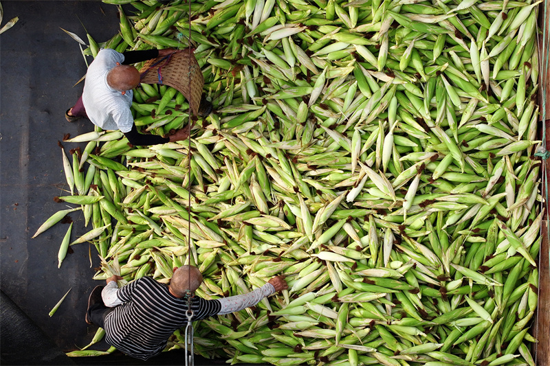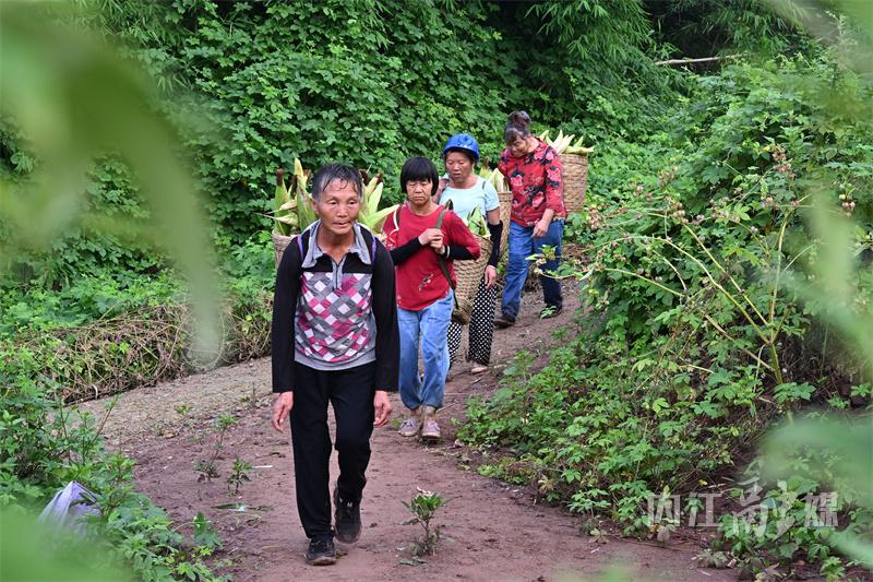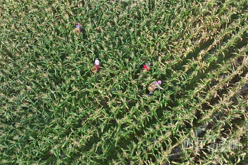 村民们穿梭在玉米地里,掰玉米的“咔嚓”声此起彼伏,鲜嫩的玉米棒纷纷落入背篓。待背篓压弯了背带,村民们直起身子,沿着田垄小心行走,将玉米转运到村道旁,再按照大小、品相进行分拣、装车,准备运往全国各地市场。