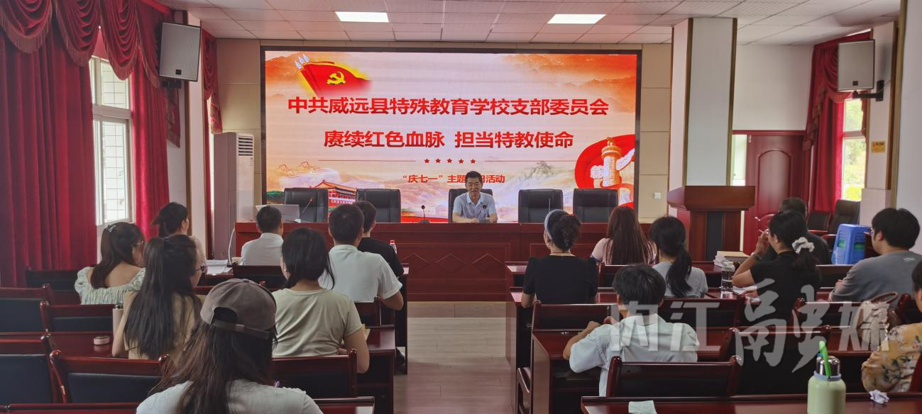 7月1日是中国共产党成立104周年纪念日。当日,威远县特殊教育学校党支部开展“赓续红色血脉 担当特教使命”主题党日活动。活动通过“重温入党誓词”“初心故事分享”“红色经典诵读”三个环节,引导全体党员干部坚定理想信念,强化党性修养,激发奋斗热情。