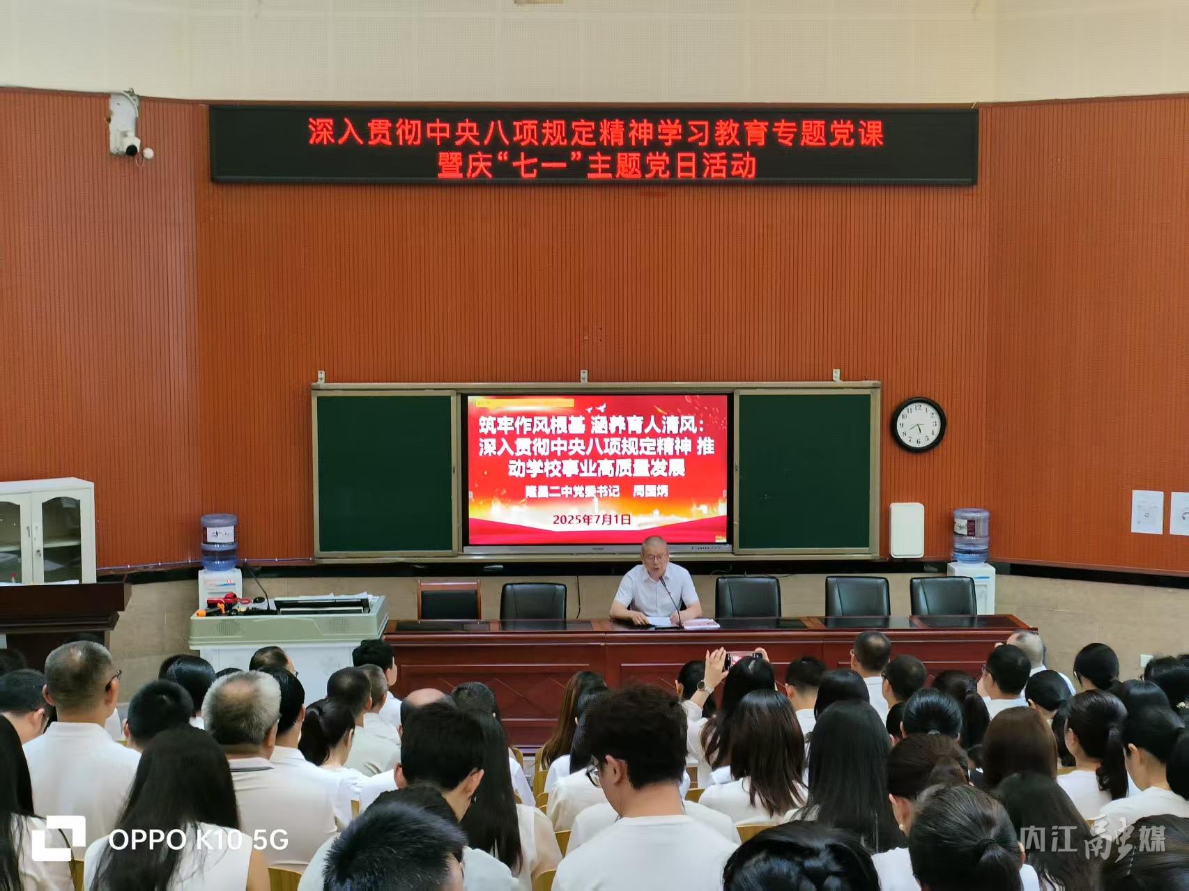 7月1日,隆昌市第二中学(简称“隆昌二中”)开展学习贯彻中央八项规定精神专题党课暨庆“七一”主题党日活动。活动通过重温入党誓词、红色文艺献礼、廉洁教育警示、先进表彰激励等形式,将庆祝建党纪念日与纪律教育深度融合,为学校高质量发展注入红色动能。
