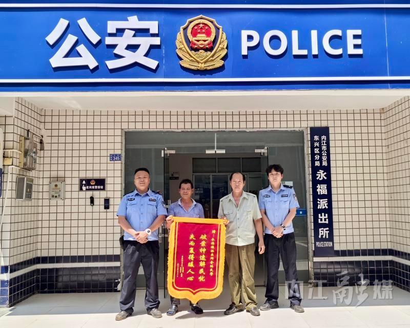 7月15日,东兴区永福镇群众熊朝勇、陈克明将一面印着 “破案神速解民忧,失而复得暖人心”的锦旗送到东兴区公安分局永福派出所,向民警快速侦破电动三轮车蓄电池被盗案表示感谢。
