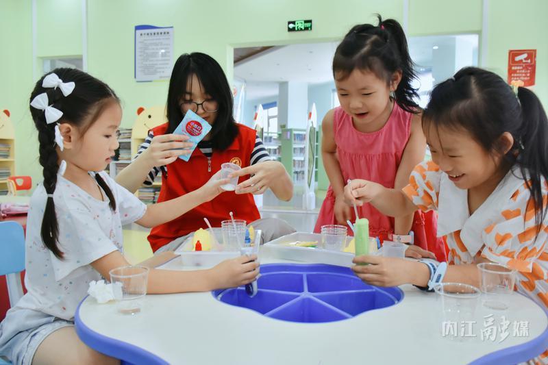 7月15日,2025年“我在新时代文明实践中心过暑假”暨“走进图书馆·欢乐暑期行”系列活动在东兴区图书馆的甜城宝贝屋火热开展。数十名小朋友化身为小小“科学家”,在大学生志愿者的带领下,利用小苏打、柠檬酸、色素等材料,上演了一幕精彩的现实版“魔法秀”。