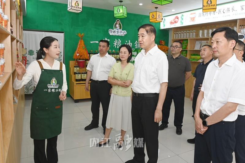 博传网络科技有限公司拥有自媒体联盟基地、知名新媒体品牌等,已累计开展助农直播50余场;网络主播杨丹丹全网粉丝超过400万,是内江网红达人线上带货走向线下实体的成功典范;沪超比那多超市创新智慧零售模式,实现线上平台与线下门店的全渠道融合。邹自景先后走进博传网络科技有限公司、杨丹丹·一家粮油铺线下门店、沪超比那多超市,与网络主播、电商企业和超市负责人亲切交流,了解直播带岗、直播带货、线上线下销售等情况,勉励他们进一步丰富销售产品、创新工作方式,做大业务量、增加销售额,帮助销售更多内江特色农副产品。