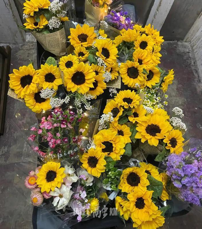 不远处的向日葵摊位前,花盘饱满,花瓣厚实又有光泽。“这花早上五点从田里砍下来,裹着湿报纸运过来,保证到顾客手里还直挺挺的。”摊主老何黝黑的手握住花茎,咔嚓一声剪掉多余的叶片。他说向日葵的价格实在,一大束带着花苞的向日葵仅15元,成了不少年轻人装点房间的首选。偶尔他遇到学生模样的顾客,还会多塞一支花苞。