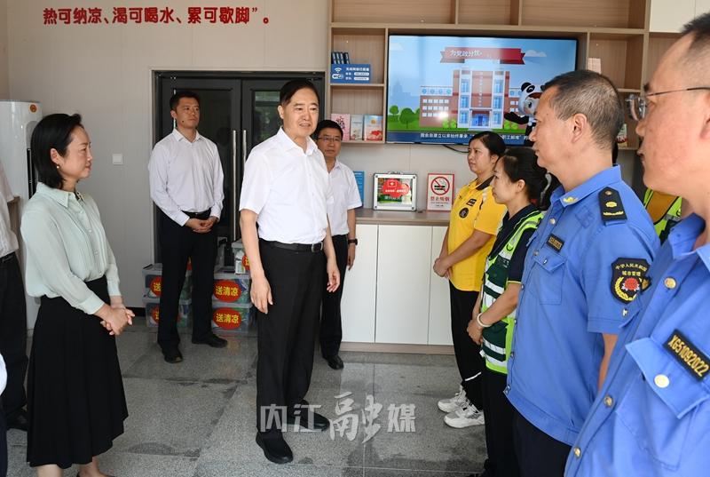 东兴区太白路林荫大道广场工会驿站,为城市户外工作者提供了休憩场所。“大家辛苦了!”邹自景走上前,与环卫工人、外卖骑手、城管队员等亲切握手,询问他们工作、生活情况,叮嘱他们做好个人防暑降温,注意交通安全。邹自景指出,要提升城市驿站管理水平,坚持以人为本,注重简单实用,为城市户外工作者们提供一个庇护场所,彰显城市温度。