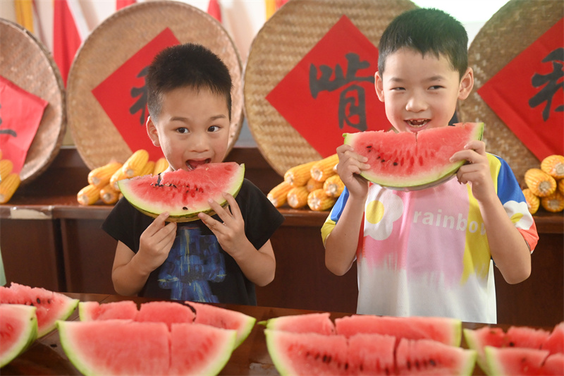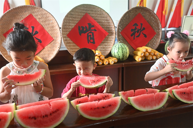 “西瓜好甜!”刚吃完瓜的孩子舔着嘴唇,凑到志愿者身边问,“明天还能啃秋吗?”一句话逗乐了在场所有人。托管班负责人表示,后面还会开展做月饼、猜灯谜等民俗活动,让孩子们在玩乐中感受传统文化魅力。