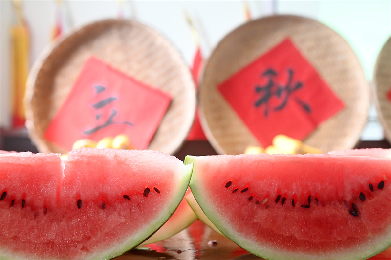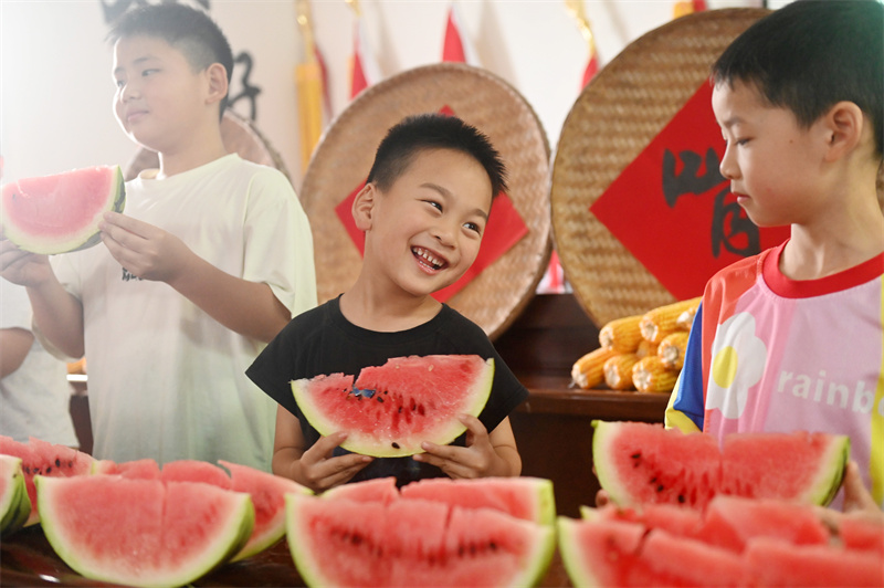 她指着照片里田间劳作的人们,继续说道:“以前的人在立秋这天,再忙也要买个西瓜分着吃,图个吉利。”孩子们瞪着好奇的眼睛,有的还伸手摸摸桌上圆滚滚的西瓜,仿佛想从冰凉的瓜皮上探寻节气的秘密。