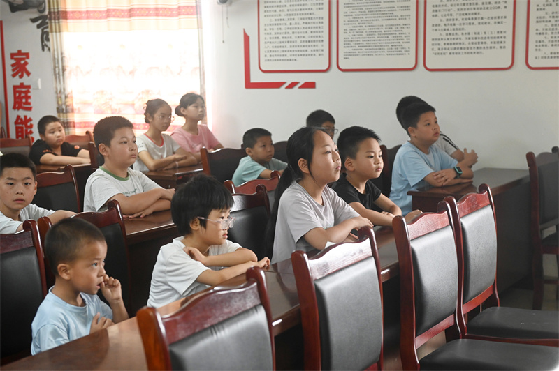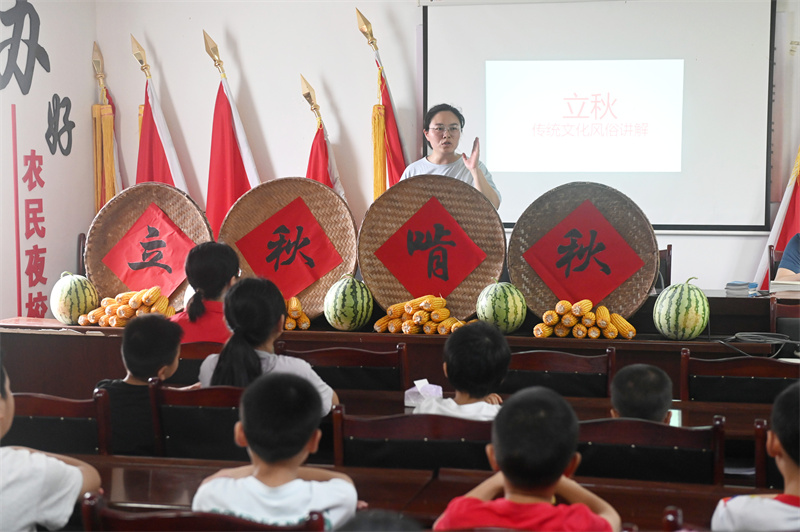 活动室里凉意融融,墙角的风扇慢悠悠转着,墙上贴满了孩子们手绘的向日葵和节气海报。志愿者李佳璐拿着一张泛黄的老照片,给孩子们讲述“啃秋”的由来:“立秋这天吃西瓜,叫‘啃秋’,寓意咬住秋天的尾巴,不生病、长得壮……”
