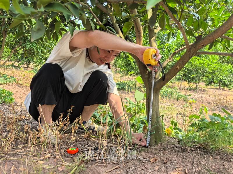 8月5日,在市中区朝阳镇铧匠冲村川红橘种植基地里,普查工作小组工作人员正手持卷尺、GPS定位仪等工具,围着一棵枝繁叶茂的川红橘树忙碌。“树高6.5米,枝下高1.1米,胸径12.8厘米,地径16.6厘米,冠幅3.5×3.6米……”大家一边测量,一边将数据精准记录在调查表上,同时用相机记录果树的生长状态、挂果情况等细节。