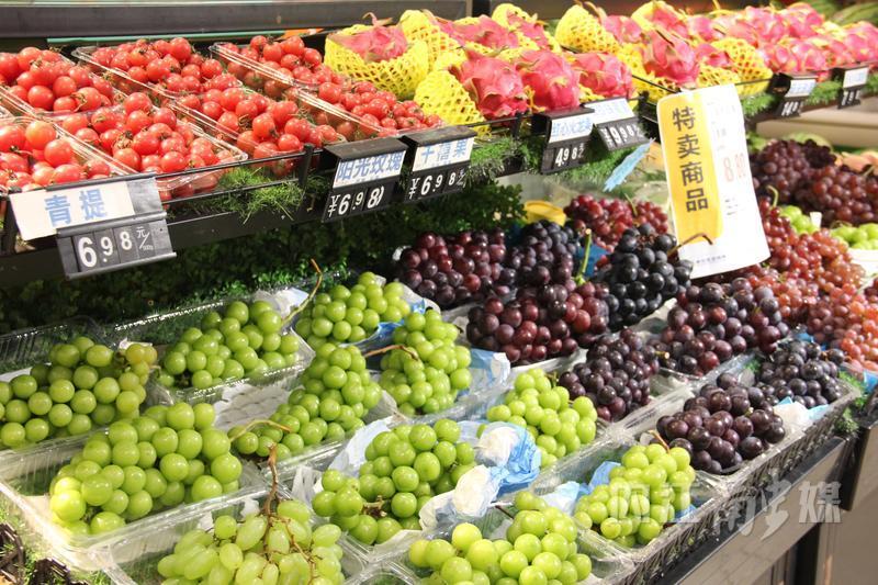 旁边是应季水果区,葡萄、火龙果、西瓜等水果散发着诱人香味。