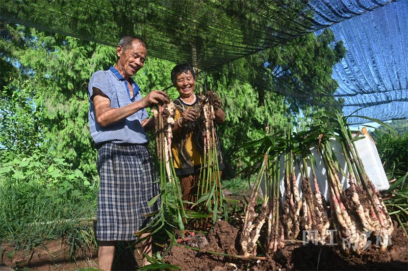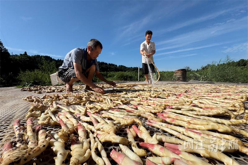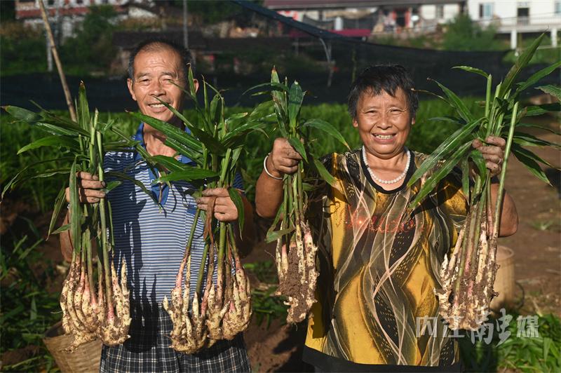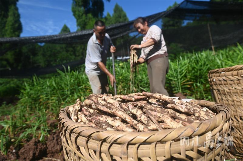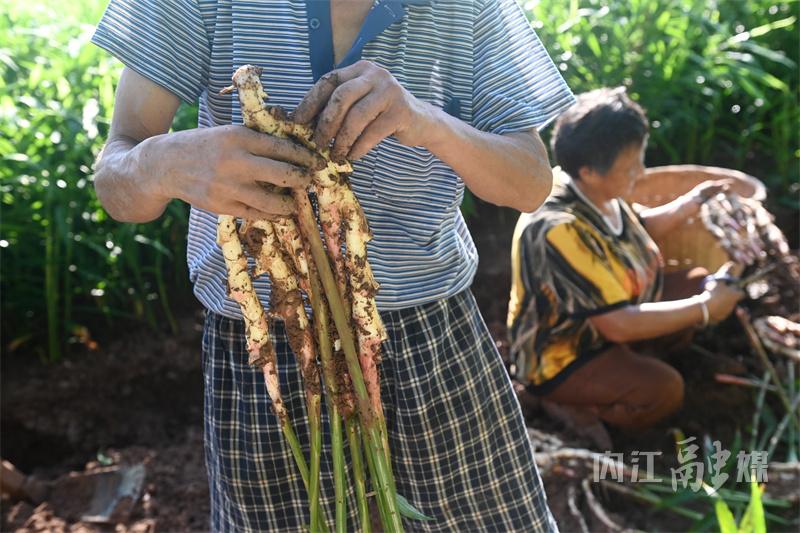 8月12日,内江市东兴区永福镇新庙子村的生姜种植基地里一片繁忙。翠绿茂密的姜田间,村民们三五成群,分工明确地忙着挖姜、去秆、除泥、装袋。刚挖出的生姜体态饱满、色泽好,田间地头处处洋溢着丰收的喜悦。