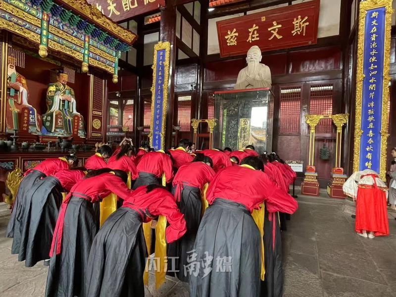 当天,学子们身着传统服饰,在资中文庙参与庄重的拜师礼仪式,行鞠躬礼、诵经典,系上祈福带,寓意“承文脉之志,启人生新篇”。在游客中心,大家品尝文创雪糕,参观文创产品展区,深入了解重龙山创国家AAAA级旅游景区规划,感受传统文化与现代创意的融合。