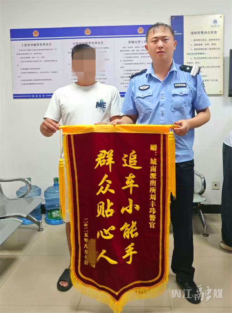 电动车失而复得,失主付某特意制作了一面印有“追车小能手,群众贴心人”字样的锦旗,送到办案民警刘丰玮手中,激动地说:“本以为找不回来了,没想到警察同志这么快就帮我追回了电动车,太感谢了。”
