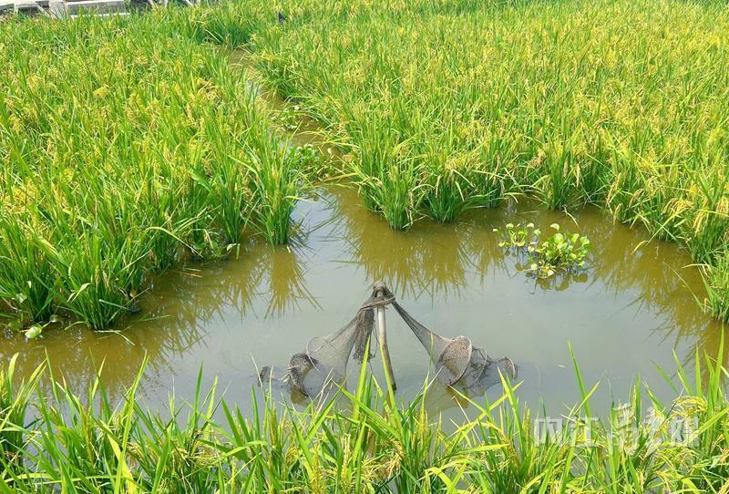 8月16日,在隆昌市胡家镇黄桷村,连片的稻虾田迎来丰收季,村民们头顶烈日收割水稻,一旁的稻田里放置了虾笼,用于收虾售卖。