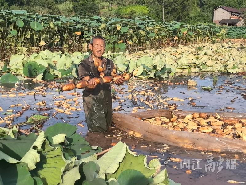 在采藕现场,伴随着机器轰鸣声,工人操作高压水枪设备将一根根莲藕从淤泥中冲至水面。不一会儿,水面上铺满新鲜莲藕。随后,工人借助塑料布制成的简易小船,将莲藕分批运到田边,再用高压水枪冲洗掉表面淤泥,一个个洁白饱满的莲藕随即显现。清洗后的莲藕被整齐摆放在田埂上,经分类、称重、装筐后,运往内江、重庆等地的批发市场与农贸市场。