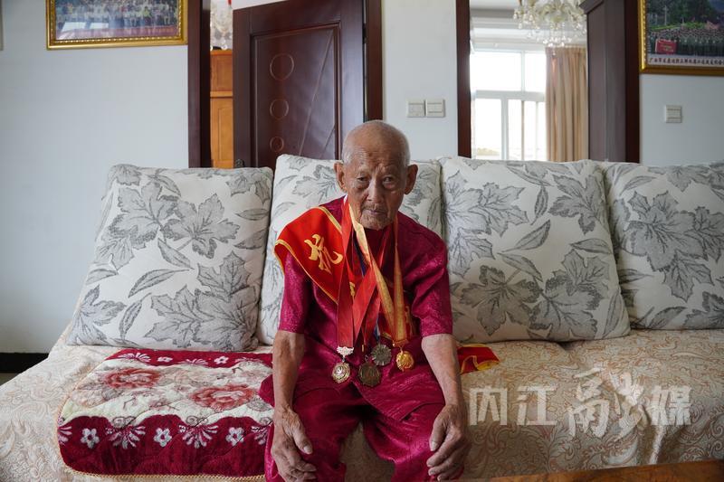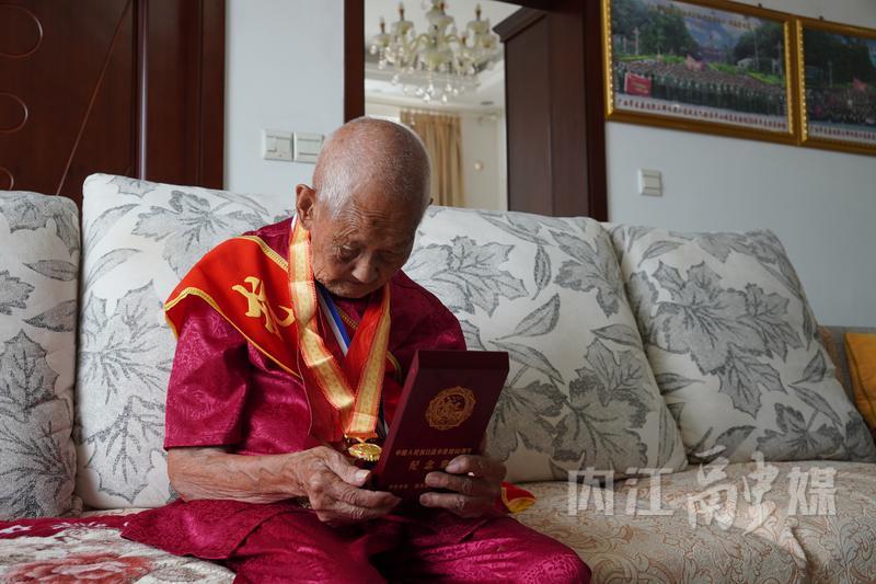 近日,记者来到内江市市中区全安镇采访102岁抗战老兵宋国良。老人端坐在大儿子宋伯树家的沙发上,身上佩戴着“抗战老兵”字样绶带和纪念勋章。让人敬佩的是,如今他仍坚持每天上午、下午都徒步上下六楼出去走走!