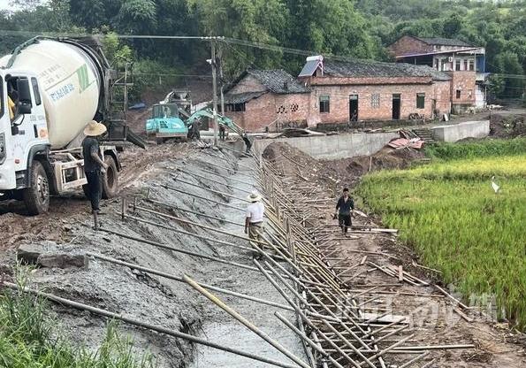 近日,在位于交通镇九盘村的施工现场,多台工程机械设备有序运行,工人们分散在各处平整路基、开挖沟槽,拓宽并硬化道路。