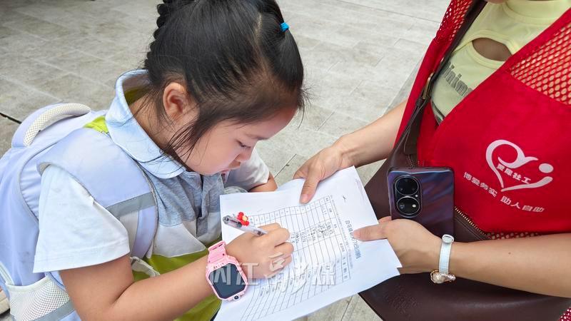 义卖活动中,社工和社区工作者主动向学生介绍“这是教师节感恩义卖,向日葵是手作扭扭棒作品”,还跟家长讲解“买花既是对老师的心意,也是支持社区公益”,过程中引导学生选款、协助支付,认真记录每笔交易;活动收尾时,大家又有序整理物资、清理场地,统计义卖金额并拍照留存资料,确保活动各环节稳妥。