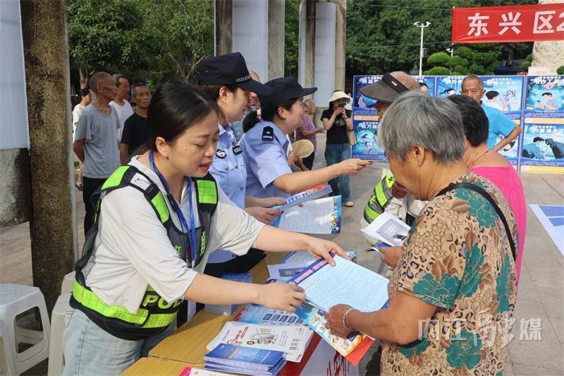 活动现场,内江市公安局东兴区分局网安大队、刑警大队反诈中心民(辅)警,通过摆放宣传主题展板、发放网络安全宣传手册、悬挂宣传横幅、现场答疑解惑、以案说法等方式,向群众宣传网络安全法律法规,普及网络犯罪、电信诈骗、网络谣言等常见网络安全风险的防范知识及网络安全防护基本技能,倡导群众自觉遵守法律法规,保护好个人隐私,防范网络诈骗,远离网络犯罪。