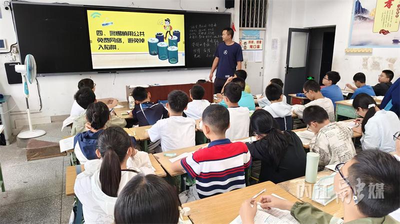 在多媒体教室,国家网络安全宣传周办公室制作的普法短视频以动画形式拆解网络安全隐患,民警则结合近期辖区发生的“游戏账号诈骗”“冒充班主任收费”“虚拟交友杀猪盘”等真实案例,用方言俚语还原诈骗场景,重点讲解“未知链接不点击”“个人信息不泄露”等防护要点。