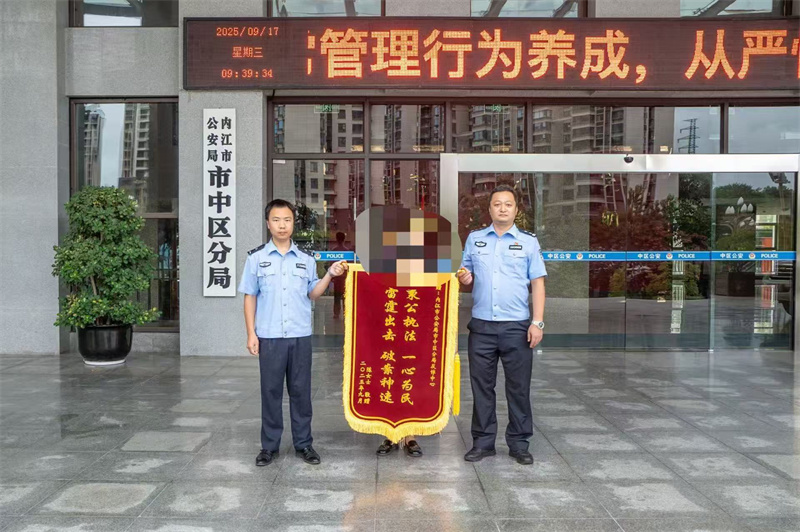 9月17日,刘女士一家先后前往白马派出所和内江中区公安反诈中心,向办案民警送上锦旗表达谢意。