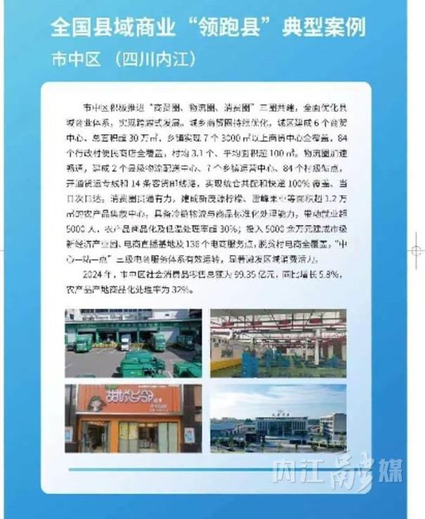 9月25日,记者从内江市市中区商务和经济合作局获悉,9月24日,商务部在浙江省杭州市举办的县域商业创新发展交流活动中发布《数字经济时代县域商业发展报告(2025)》,公布了2025年全国县域商业“领跑县”。内江市市中区被评选为全国县域商业“领跑县”,其县域商业建设经验纳入商务部2025年全国县域商业“领跑县”典型案例集,为四川省10个当选县(市、区)之一。
