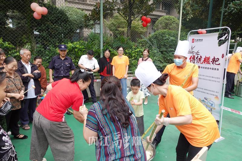 记者来到现场看到一片热闹景象,现场居民人数超过500人。糯米的蒸汽裹着香甜弥漫开来,打糍粑的号子声铿锵有力,居民们轮番上阵,体验着传统制作的乐趣。