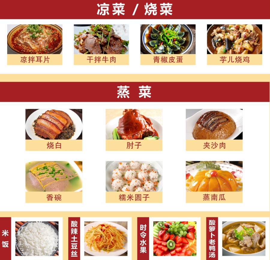 坝坝宴菜单:凉拌耳片、青椒皮蛋、干拌牛肉、芋儿烧鸡、烧白、肘子、夹沙肉、糯米圆子、香碗、蒸南瓜、酸辣土豆丝、酸萝卜老鸭汤、时令水果、米饭。