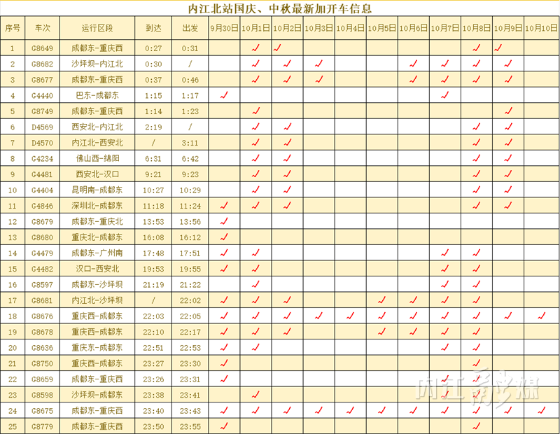 为方便旅客出行,内江北站在“双节”期间加开前往成都、重庆、西安、广州南等方向的列车共计25趟,其中包括10余趟夜间动车。针对乘车人数较多的班次,车站提前开启检票,确保旅客准时上车。同时,车站还增派了安检人员和志愿服务人员,为旅客提供温馨服务。