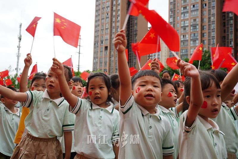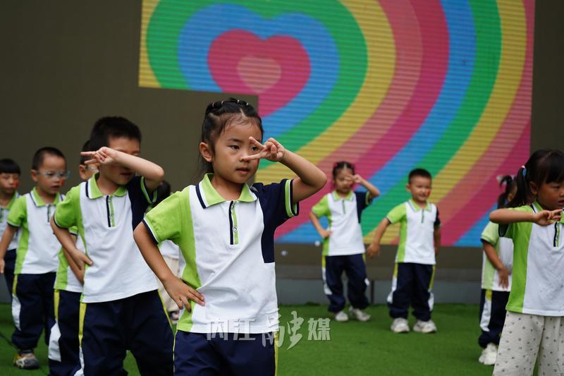 随后,庄严的升国旗仪式拉开欢乐的序幕。孩子们放声歌唱、尽情舞蹈,蹦蹦跳跳地跟随老师学习动作,欢快的气氛洋溢在整个操场之上。