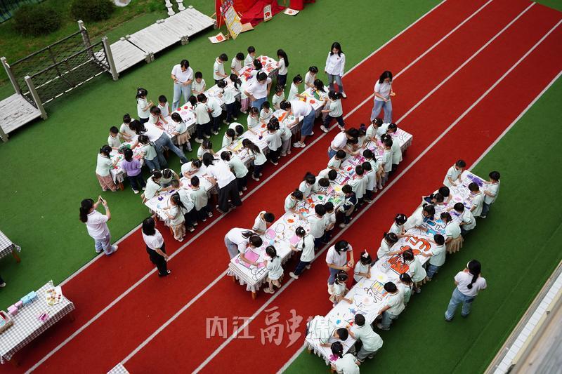 在之后的“小手绘山河,长卷庆华诞”主题绘画环节,更为活动增添了童趣。大班的孩子们齐聚操场,俯身于长长的画布前,以稚嫩的笔触勾勒出心中的壮美山河——蜿蜒的长城、娇艳的花朵、明丽的锦绣河山等等,全都是孩子们对中秋佳节和国庆节的美好认知。