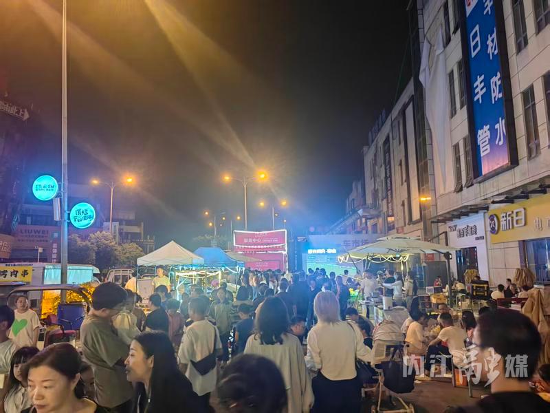 国庆中秋“双节”期间,内江商贸城星光夜市成为城市热闹的“烟火地标”。10月1日晚,伴随川超足球联赛内江队对阵自贡队的实况转播开启,这场集美食、娱乐与体育激情于一体的盛宴,再次将节日氛围推向高潮。