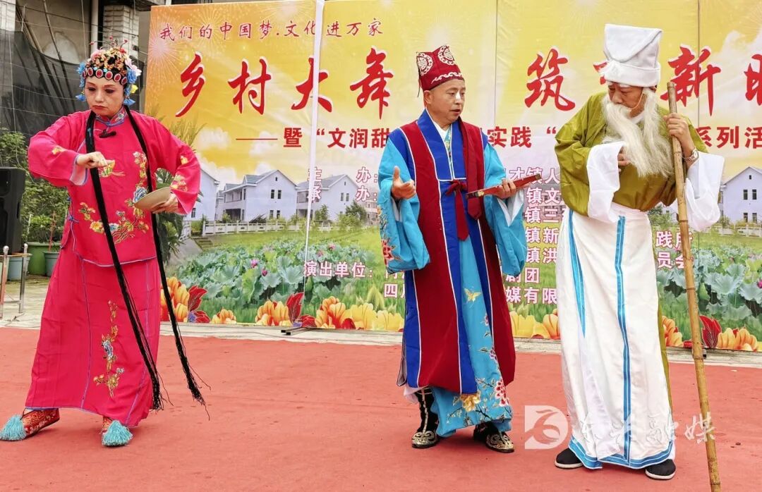 表演环节精彩纷呈,各类节目轮番登场,既有传统韵味,又不失时代气息。戏剧舞蹈《旦角戏》韵味十足,音乐舞蹈《春游》清新欢快,经典戏曲《女驸马》《江姐》细腻传神的表演,带领观众重温经典,感受传统戏曲的独特魅力;川剧折子戏《老来难》以朴实的剧情、真挚的情感引发观众共鸣,传递尊老爱老的传统美德;而川剧绝活《变脸吐火》更是将现场气氛推向高潮,演员瞬间变换的脸谱、惊险的吐火绝技,让村民们连连惊呼,纷纷拿出手机拍照记录这震撼瞬间;川剧小戏《王婆找鸡》充满乡土趣味,诙谐的台词、生动的演绎逗得台下观众笑声不绝;戏剧舞蹈《绣红旗》每一个动作都饱含赤诚与坚守,既展现了戏剧舞蹈的艺术张力,又传递出深刻的红色内涵。