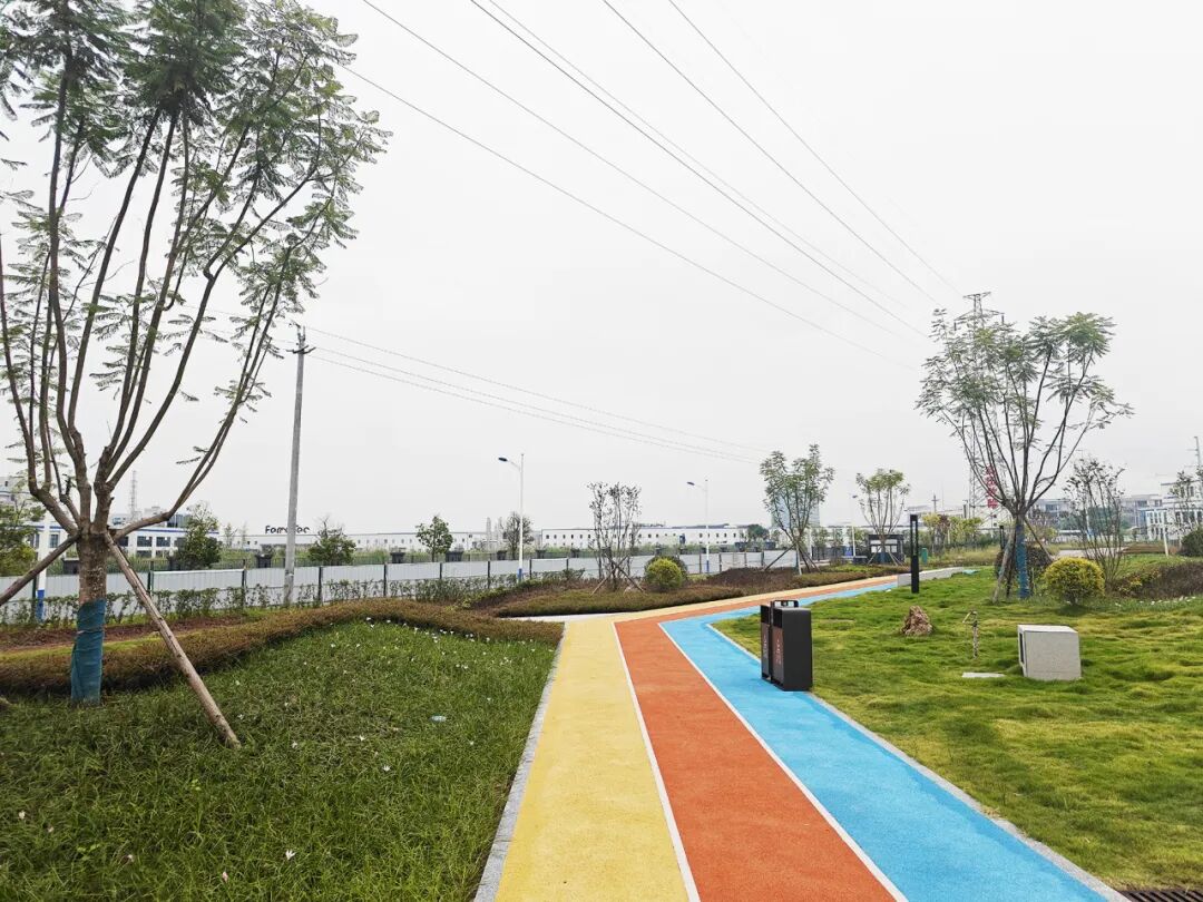 在内江经开区巨腾公司员工宿舍楼外的汉阳路地块口袋公园,彩色步道蜿蜒曲折,景观树和绿植错落交织,与周边林立的厂房共同构成了自然与工业共生的现代景观。每到周末或傍晚,这里便成为不少企业职工放松身心、交流休闲的热门打卡地。