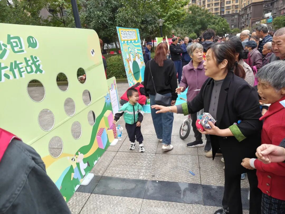 另一边,适合老年人、残疾人参与的趣味游戏也在火热进行。在“重阳投壶”区域,老人们手持箭矢仔细瞄准、精准投射。“高尔夫”区域前,老人们轮流挥杆,推球进洞。另外,“趣味套圈”“沙包大作战”“趣味保龄球”等游戏同样趣味十足,吸引众多居民排队参与,闯关领取精美小礼品。