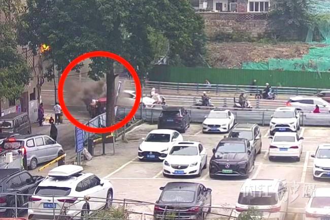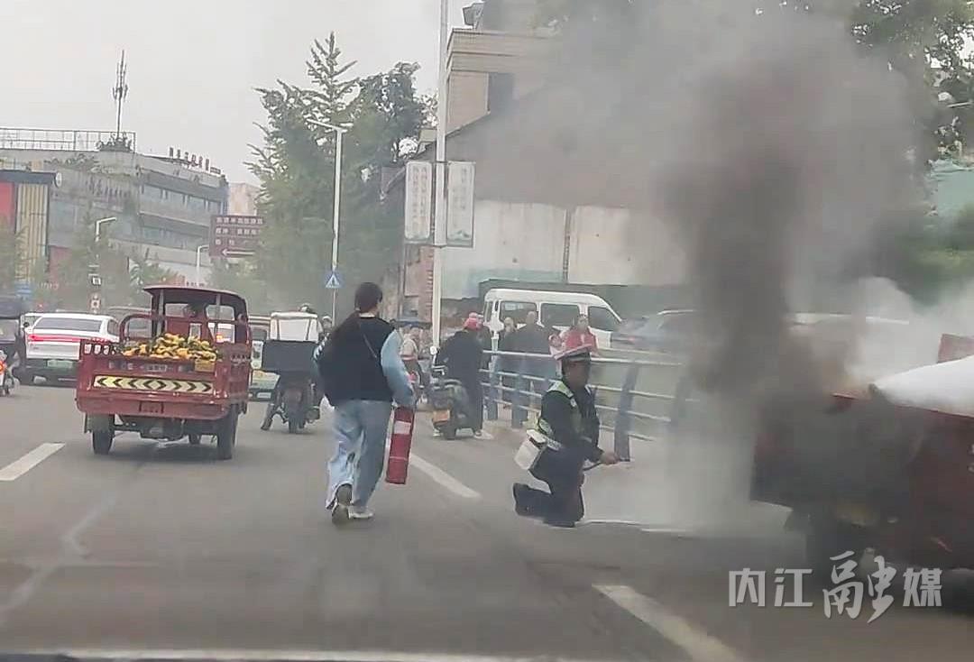 此时,正在附近执勤的内江市公安局交通管理支队直属一大队辅警赵荣听到呼救,迅速奔赴现场。只见三轮摩托车已被浓烟包裹,明火不断外窜,情况十分危急。