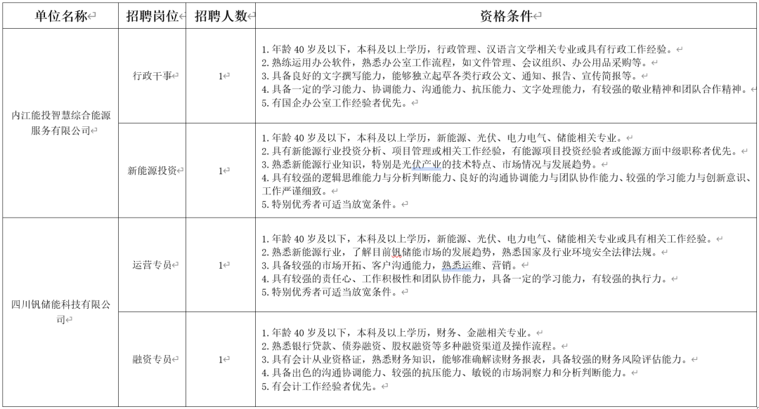 四川钒储能科技有限公司是能投公司下属全资子公司,主要经营业务有储能技术服务、信息系统集成服务、电池制造、机械电气设备制造、危险废物经营、发电业务、供(配)电业务、检验检测服务等。