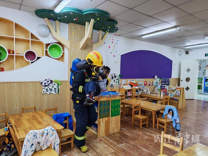 另一边,安靖园的演练充满真实感。“大一班教室着火,有小朋友被困!”模拟警情传来,消防员迅速穿戴装备,破门而入,小心翼翼将“被困萌娃”抱出。看到消防员叔叔奋不顾身的样子,小朋友们眼里满是崇拜:“叔叔太勇敢啦,像超级英雄!”