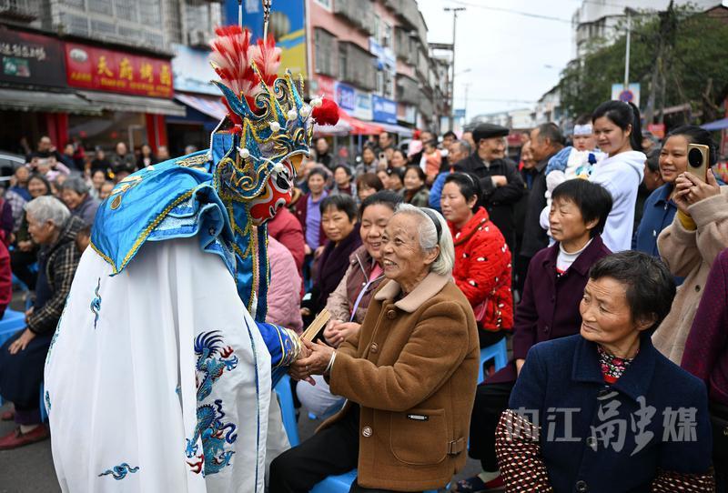 11月11日,东兴区双桥镇清源社区群众认真观看精彩的戏剧节目。