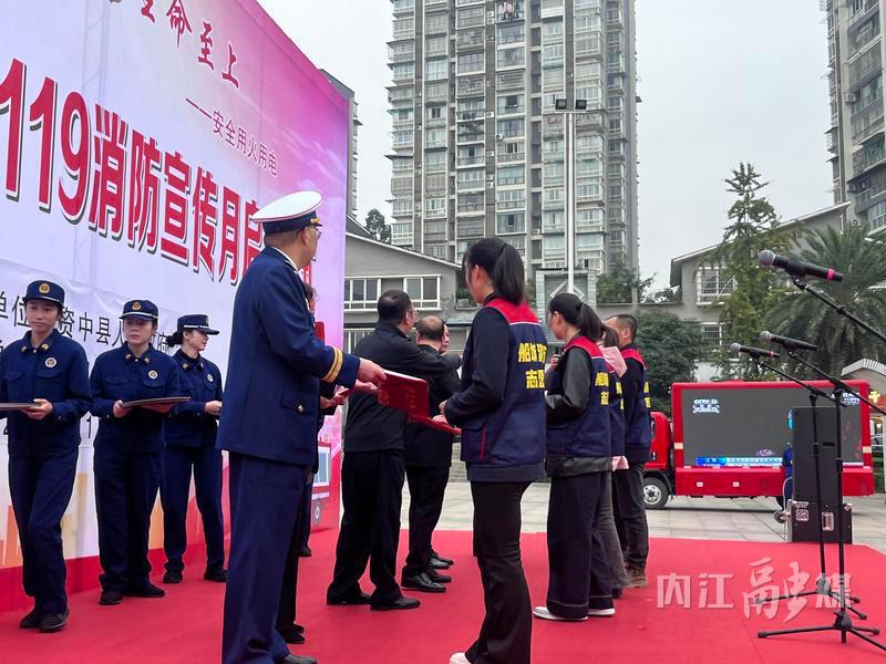 在启动仪式现场,资中县消防救援大队大队长宣读了2025年消防宣传月方案,对优秀消防志愿者授荣誉证书,县政府副县长杨杨致辞并宣布活动正式启动。启动仪式现场,器材装备展示区和灭火器体验区成为群众关注的焦点,消防宣传人员逐一展示各类消防救援器材,结合实际案例详细讲解装备的功能参数、适用场景及操作要领,还主动邀请过往群众“零距离”上手体验灭火器。